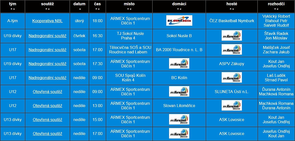 Přehled utkání týmů BK Horejsek Děčín v tomto týdnu