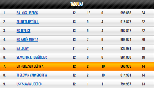 V pátek večer odehraje doma A-tým mužů další zápas severočeské ligy proti libereckému LYNXu. Postavení v tabulce a prohra na palubovce soupeře (42:87) favorizují hosty.