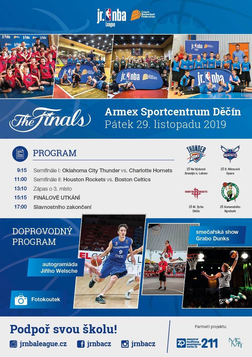 Čtvrtý ročník prestižní školní basketbalové soutěže Jr. NBA League vyvrcholí 29. listopadu v Děčíně, kde se ve Sportovním centru utkají čtyři nejlepší celky o prsteny pro nové šampiony. Děti ze základních škol v Děčíně, Brandýsa nad Labem, Opavy a Nymburka se obléknou do barev týmů NBA a pokusí se vyhrát první velkou trofej svých začínajících kariér. Finále se odehraje od 15:15 v přímém přenosu Nova Sport.